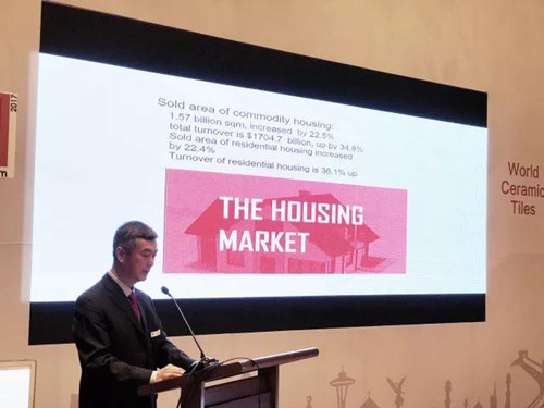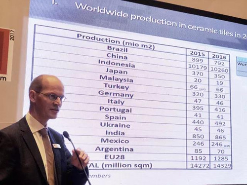 歐盟陶瓷協會秘書長RENAUD BATIER先生宣布會議開始并對國際瓷磚貿易、生產和消費進行解讀。