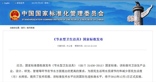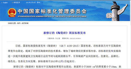 日前,國家質(zhì)量監(jiān)督檢驗檢疫總局、國家標準委批準發(fā)布中華人民共和國國家標準公告(2015年第15號),由我院負責起草的《陶瓷磚》(GB/T 4100-2015)和《節(jié)水型衛(wèi)生潔具》(GB/T 31436-2015)國家標準同時發(fā)布,將于2015年12月1日起正式實施。 該兩項國家標準由我院負責位起草,是建筑衛(wèi)生陶瓷行業(yè)標準化建設(shè)過程中具有重要意義的標志性成果。 兩項新標準圍繞節(jié)約用水、節(jié)約利用礦產(chǎn)等資源,進一步提升相關(guān)技術(shù)指標要求,不斷降低資源消耗強度。新修訂的《陶瓷磚》標準提高了行業(yè)準入門檻,增加了對陶瓷磚厚度的限定要求;新制定的《節(jié)水型衛(wèi)生潔具》標準對坐便器、花灑等8類常用產(chǎn)品節(jié)水性能提出了具體要求,每年可節(jié)約廚衛(wèi)用水量30%以上。標準的發(fā)布與實施對促進我國建筑衛(wèi)生陶瓷行業(yè)質(zhì)量的全面提升,對節(jié)約水資源、礦產(chǎn)資源都有重要推動作用。 在國標委組織的新標準發(fā)布會上,院標準室主任、全國建筑衛(wèi)生陶瓷標準化技術(shù)委員會秘書長王博接受了中央電視臺、中央廣播電臺記者的采訪,采訪在CCTV-1及各地新聞聯(lián)播都有播出,在行業(yè)及全社會都引起了很大的反響。