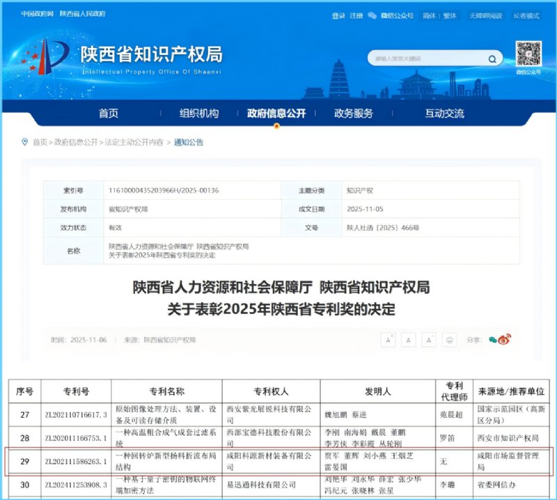11月6日,陜西省人力資源和社會保障廳、陜西省知識產權局聯合印發《關于表彰2025年陜西省專利獎的決定》(陜人社函〔2025〕466號),咸陽科源新材裝備有限公司自主研發的發明專利“一種回轉爐新型揚料折流布局結構”(專利號:ZL202111586263.1)憑借突出的技術創新性與良好的應用成效,獲評2025年陜西省專利獎優秀獎。
