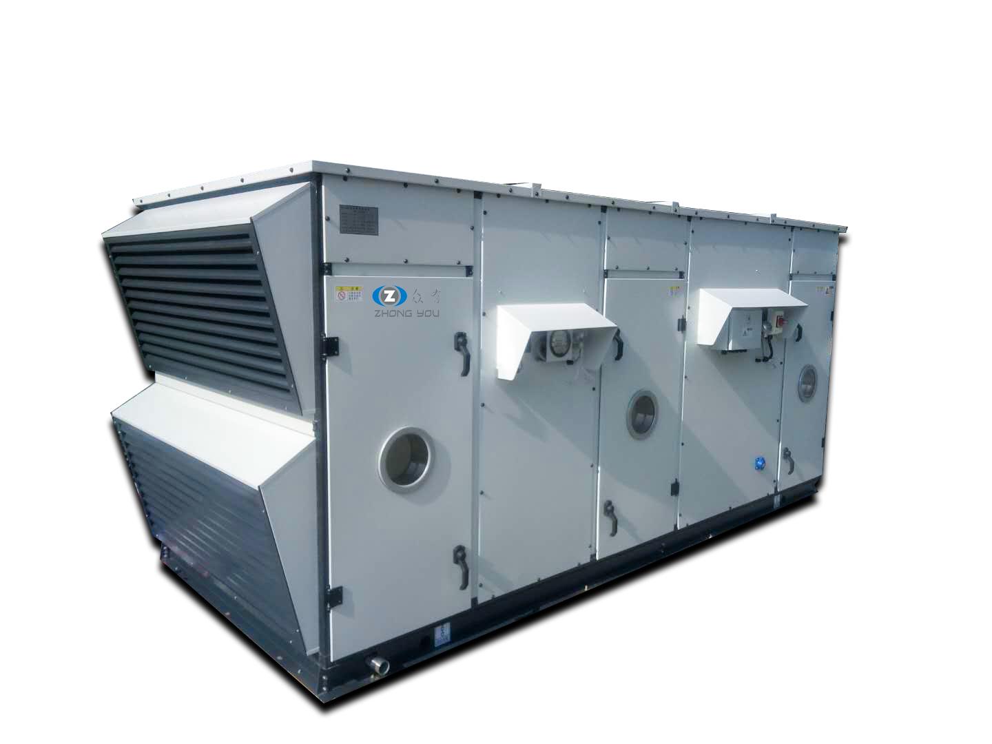將室外的新鮮空氣經處理后送入封閉區域、房間的機組,其蒸發器進風方式為全部新風(或者新風量占總送風量50%以上的也可以參考本規范),特點是工況惡劣、工況變化大。此類機組包括制冷、制熱、加濕、除濕、通風、潔凈等功能。其目的是為了配合回風機組,對房間工況進行調節,一般精度要求不高。