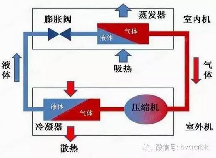制熱的時候有一個叫四通閥的部件,使冷媒在冷凝器與蒸發(fā)器的流動方向與制冷時相反,所以制熱的時候室外吹的是冷風(fēng),室內(nèi)機(jī)吹的是熱風(fēng)。其實就是用的初中物理里學(xué)到的液化(由氣體變?yōu)橐簯B(tài))時要排出熱量和汽化(由液體變?yōu)闅怏w)時要吸收熱量的原理。