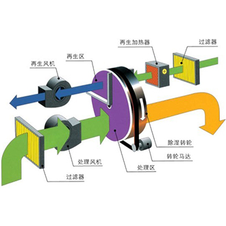 當處理空氣通過轉(zhuǎn)輪的處理區(qū)域時,其中的水蒸汽被轉(zhuǎn)輪中的吸濕介質(zhì)所吸附,水蒸氣同時發(fā)生相變,變?yōu)橐簯B(tài)水,并釋放出潛熱;這時,處理空氣因自身的水份減少而變成干空氣;之后,處理空氣由處理風機送出,變成干的、熱的空氣。